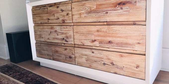 Chest of drawers with solid colour exterior and oak gola handle drawers.