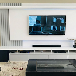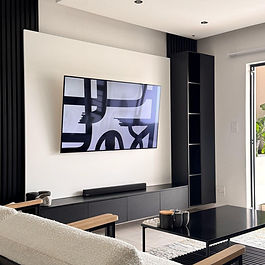 Matte black floating TV unit with oak vertical slats and pigeonhole style storage.